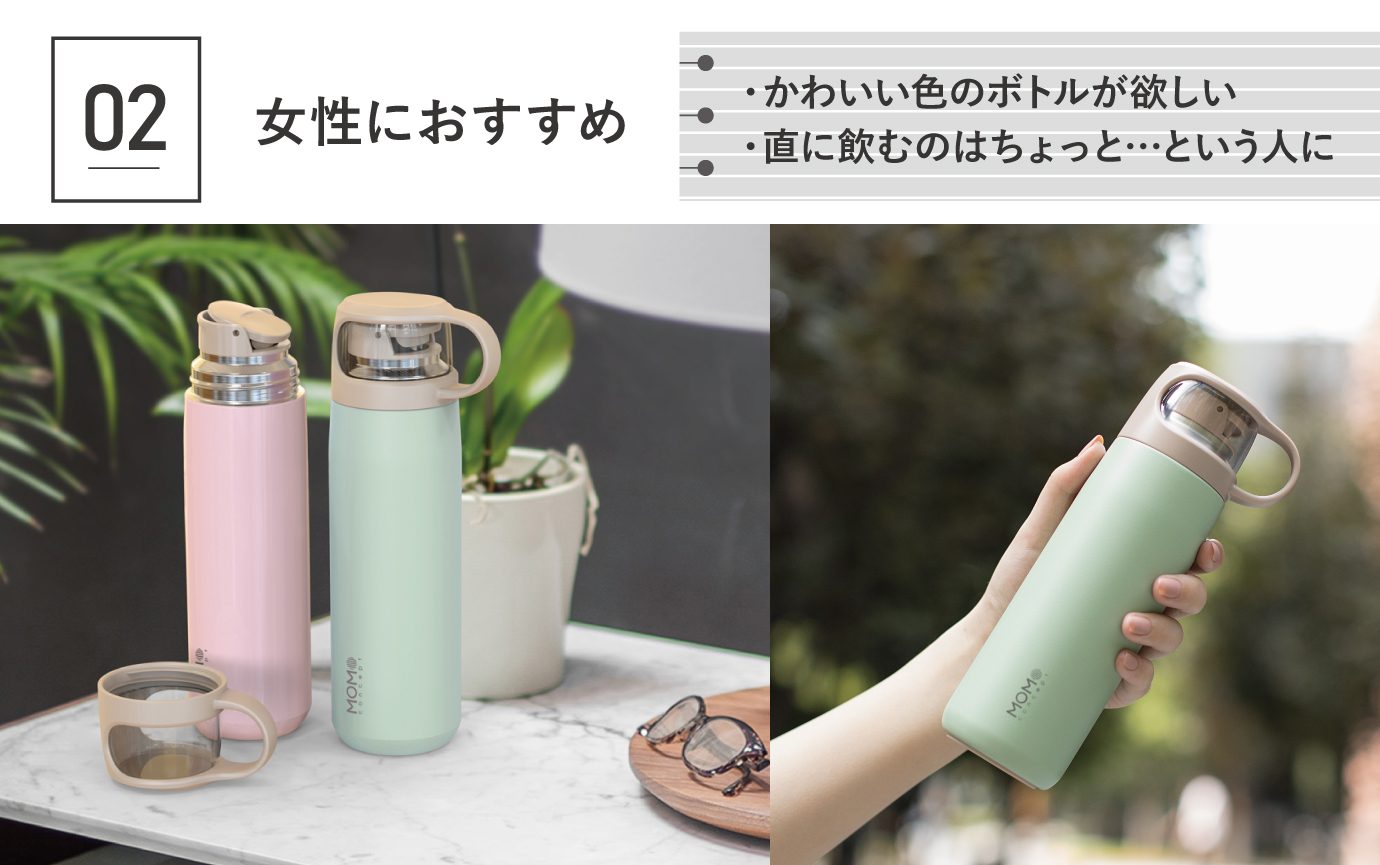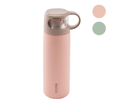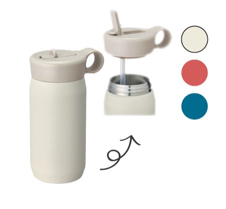 ナチュラルでやわらかい色合いも魅力のコップ付き水筒。口を直接つける必要がないので、リップや保湿クリームが本体の中身と混ざらないのがうれしいポイント!保冷・保温機能付き、開閉もワンタッチで使いやすさ抜群です。