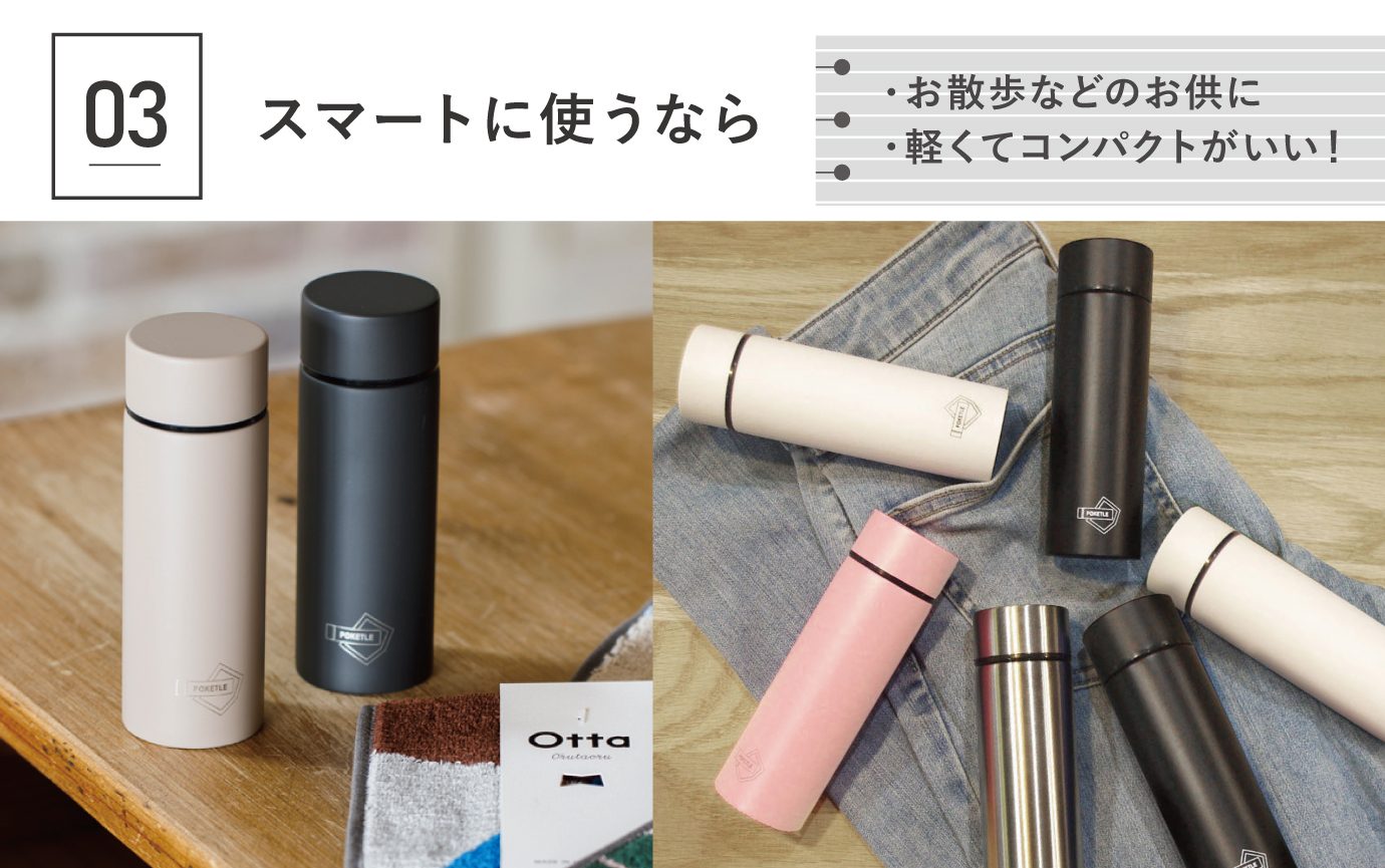 ミニバッグやパンツのポケットにもすっぽりと収まるコンパクトなボトル、「POKETLE(ポケトル)」。スマホより小さくて軽いサイズ感だから、バッグを持たずにポケットに入れてもOK。コップ約1杯分の120mLを楽々持ち歩けます。