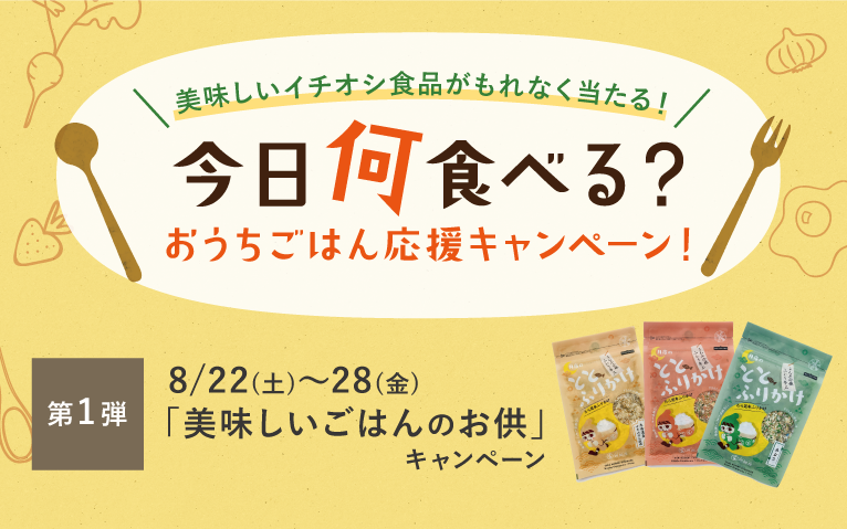 第1弾は「美味しいごはんのお供」キャンペーンを実施!8月22日(土)~28日(金)の期間、[とろりんスープ]または[ととふりかけ]を2点以上ご購入で、ととふりかけを1点プレゼントいたします。
