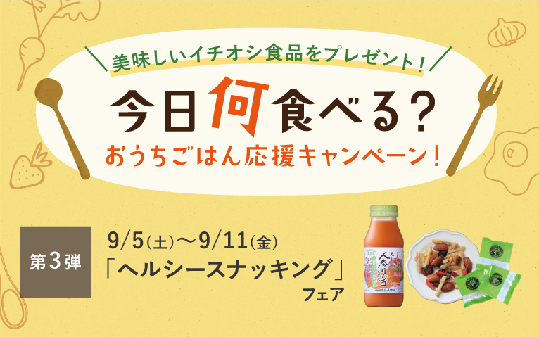 【※この記事は過去の記事です】 おうちごはん応援キャンペーン第3弾は「ヘルシースナッキング」フェア! 対象商品を2点以上ご購入で「ナッツスナッキング小袋」または「マルカイジュース」1点プレゼント♪