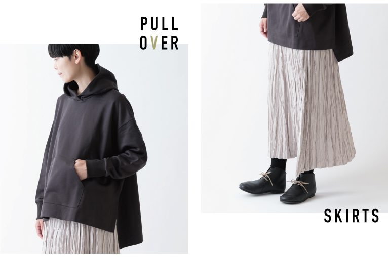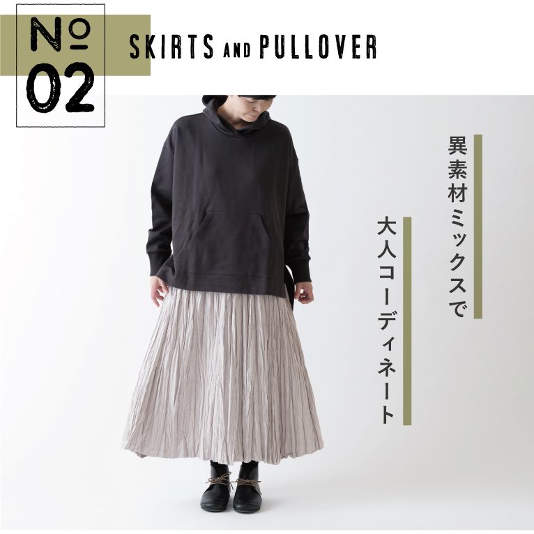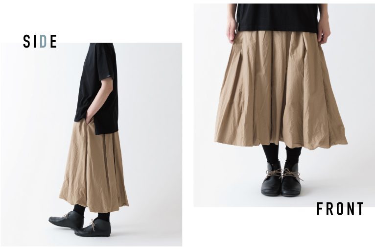 ワッシャー加工がされた、しっとりなめらかな素材感のスカートと、
