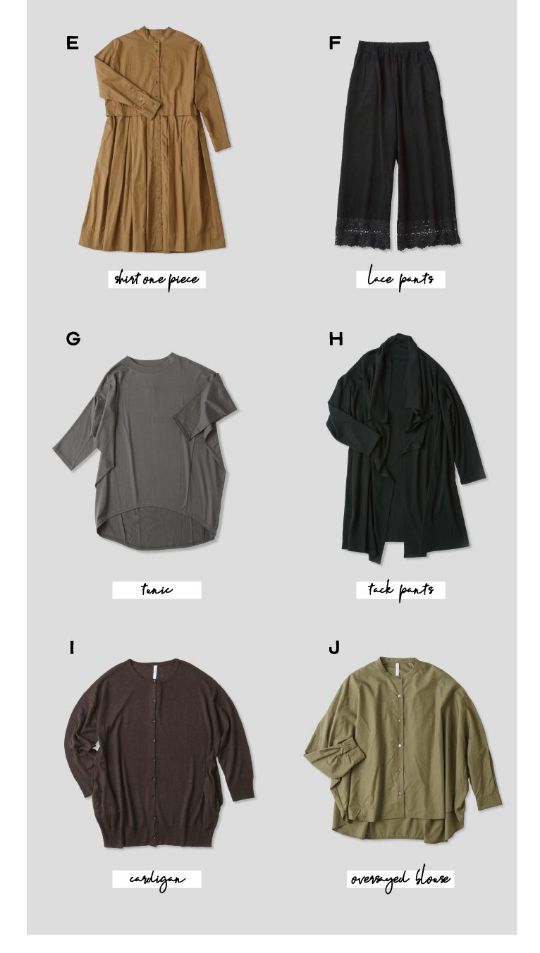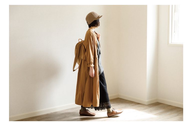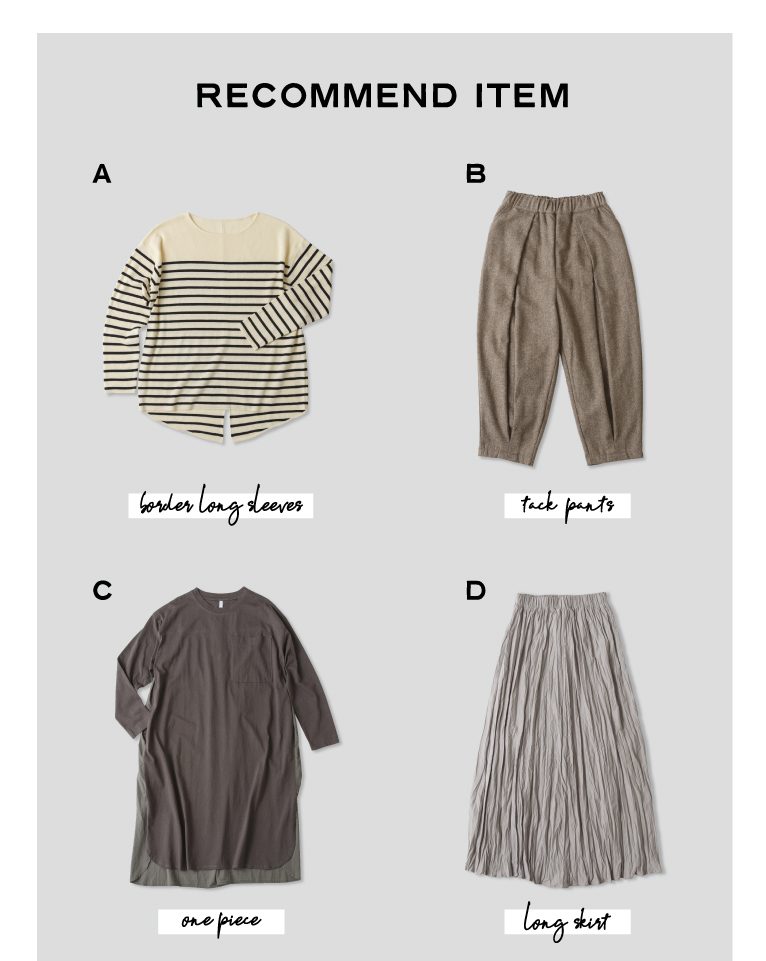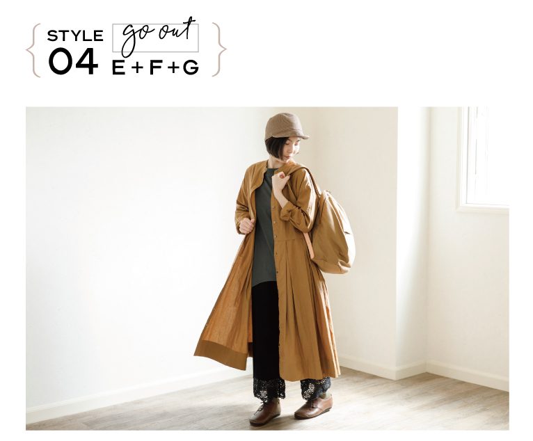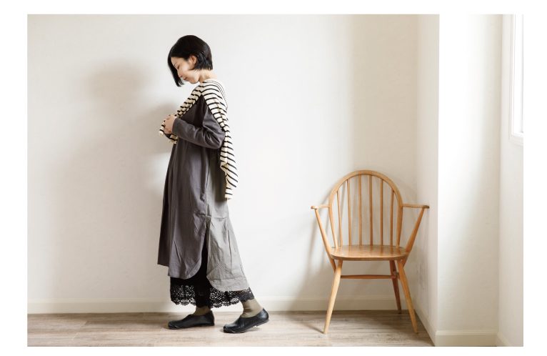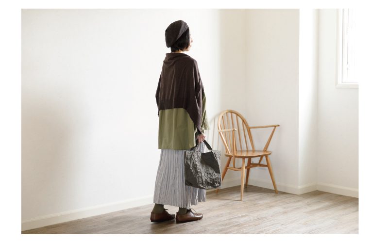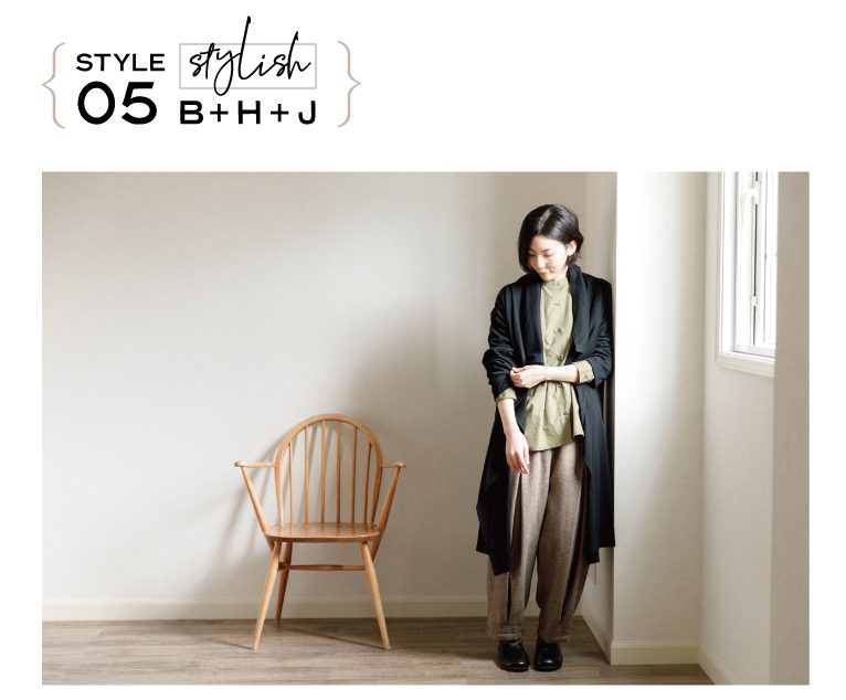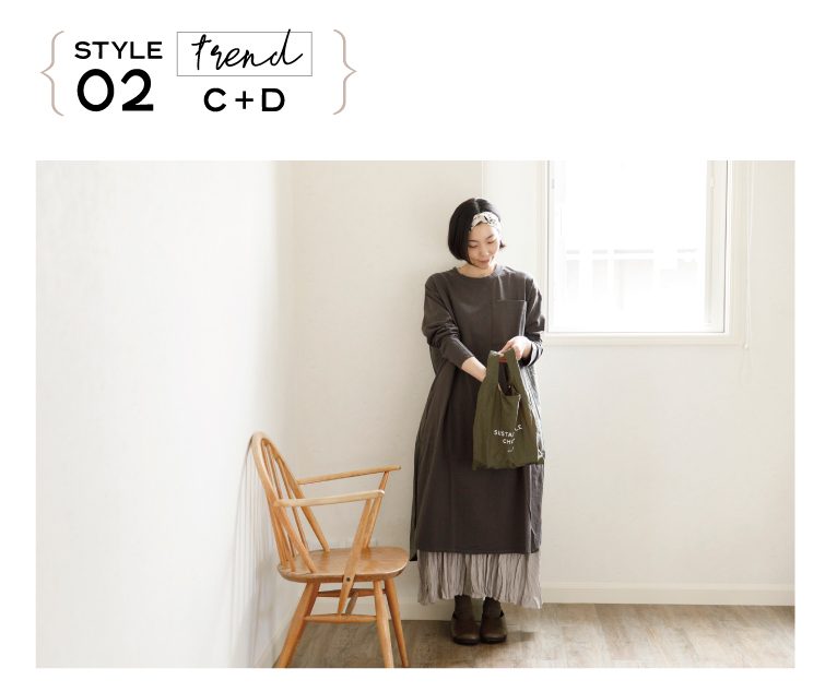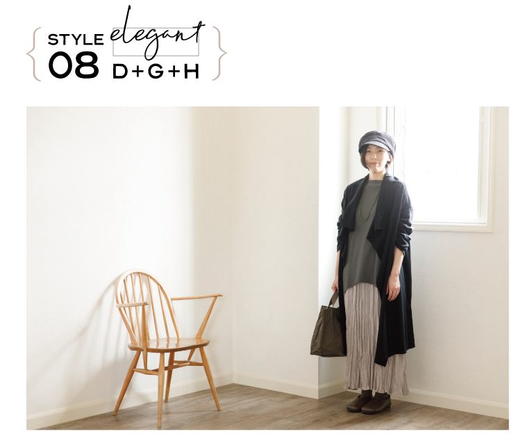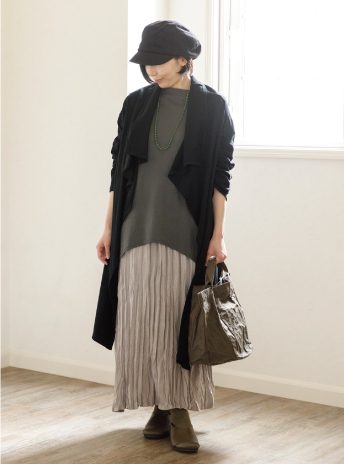ストンとした長めのアイテムの組み合わせで、縦長のIラインを意識すれば、スッキリとした装いに。