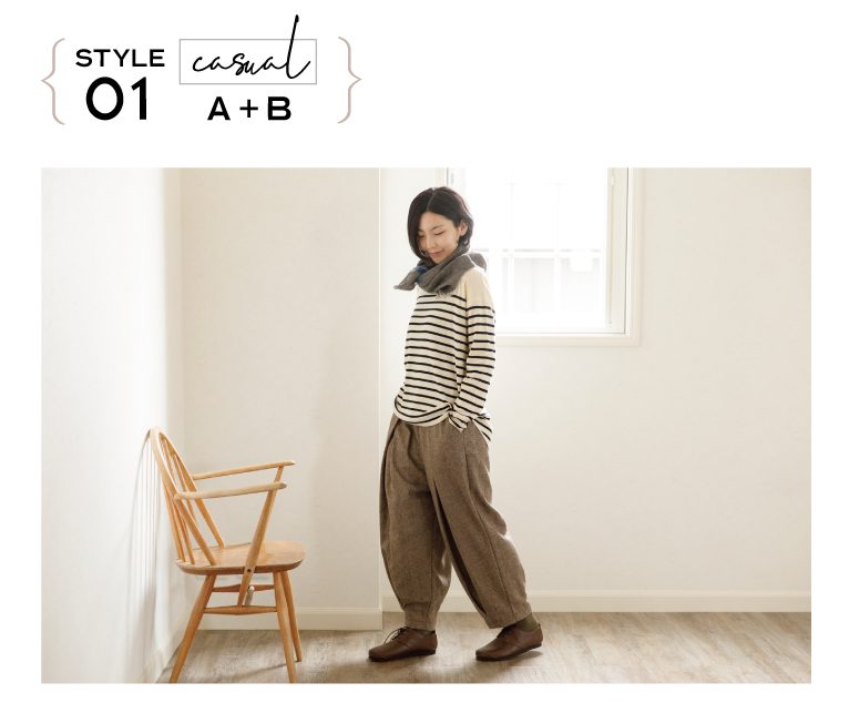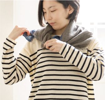 ボーダー+ゆったりパンツのカジュアルコーディネートには、首元にストールを組み合わせてアクセントを。ルーズに巻いて、結び目を少しずらすと、布の表情も出てより大人っぽい印象に。