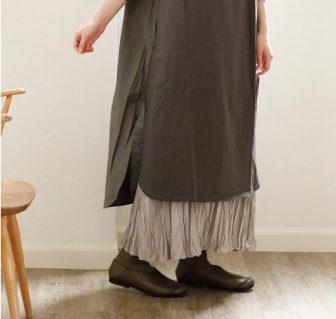 ワンピースとスカートの重ね着は今季おすすめのトレンドコーディネート。ワンピースに施されたサイドスリットとバックギャザーで動きやすさも抜群です。