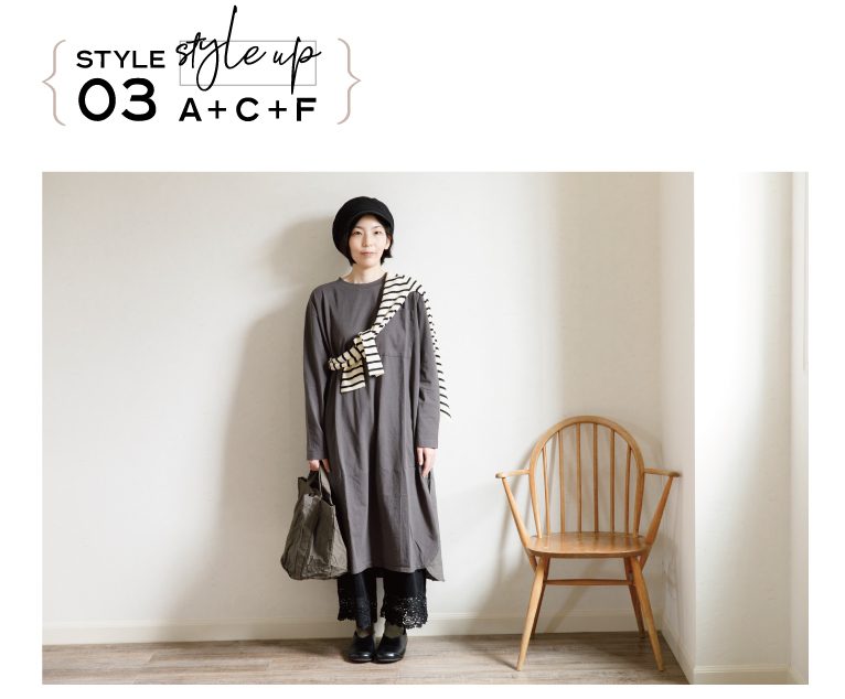 落ち着いた色合いのコーディネートには、ボーダートップスのたすき掛けで目線を上げてスタイルアップ効果を。また、ストールのように羽織ると柔らかい雰囲気を演出できます。