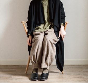 ナチュラルカラーのゆったりしたパンツスタイルで、ラフに着こなしながらもフロントのドレープが個性的なカーディガンをコーディネートして洗練された雰囲気に。