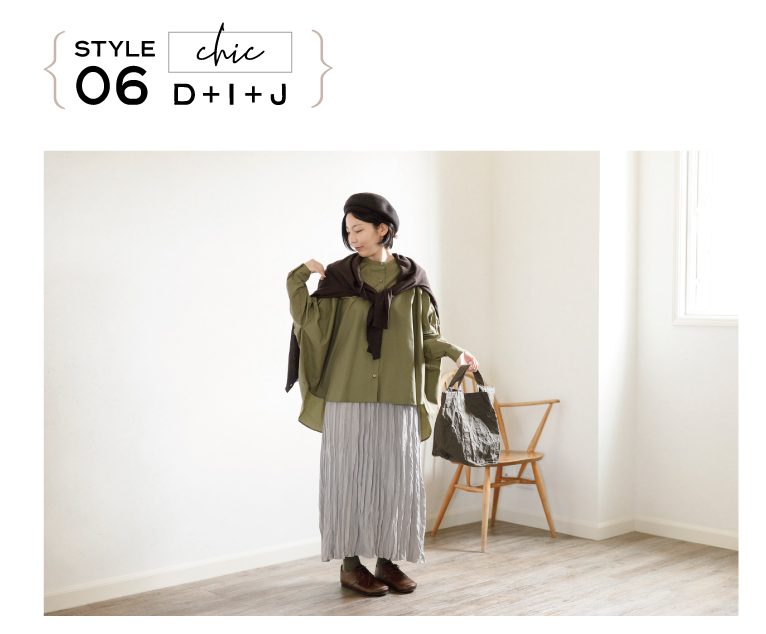 バンドカラーのブラウスと合わせてシックな大人ナチュラルスタイルに。