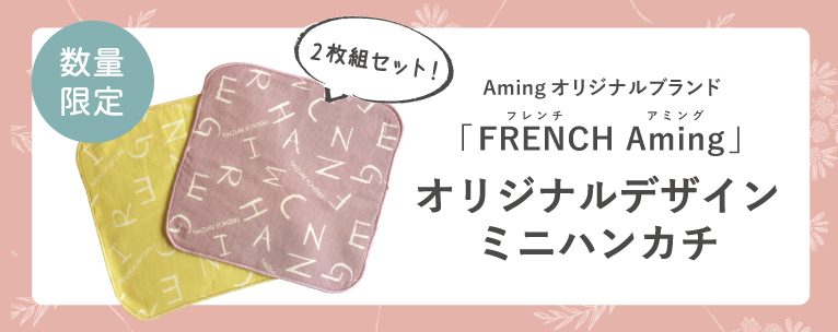 ベビー&キッズの下記対象商品を税込5,000円以上ご購入で、アミングオリジナルブランド「FRENCH Aming(フレンチアミング)」のミニハンカチを1点プレゼント!!