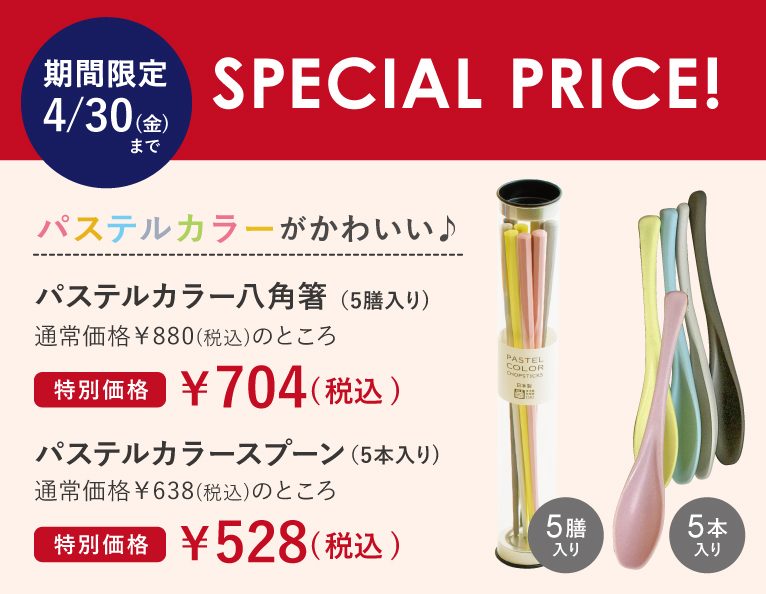 ラフルでキュートなパステルカラー八角箸5膳入りが、期間限定でスペシャル特価に!転がりにくく、持ちやすい八角形の箸が5膳入りで704円(税込)とお得な価格に。今回は同カラーのスプーンも5本入りで528円(税込)に!セットで買えば食卓のトータルコーディネートにぴったりです。