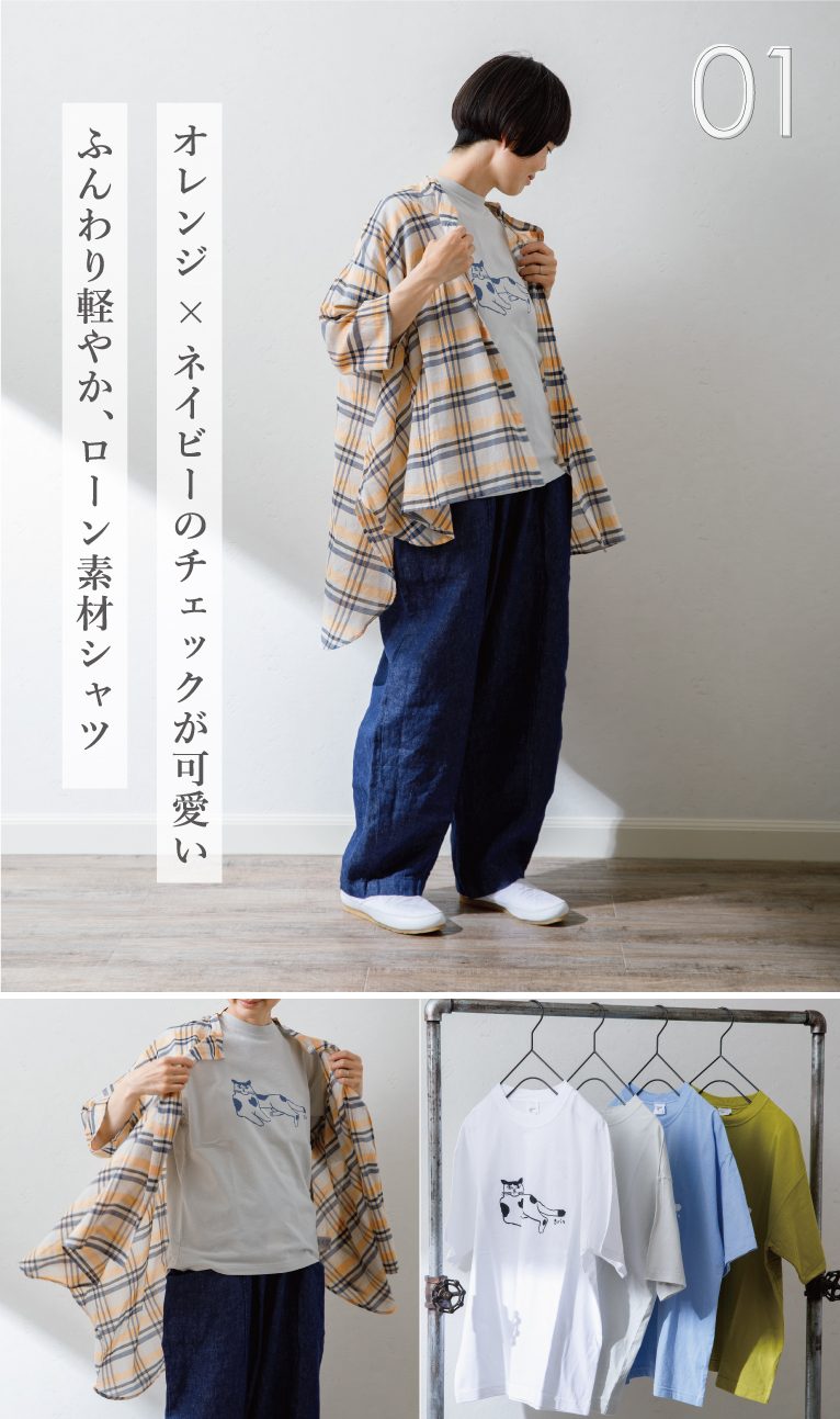 薄地で軽く、滑らかな肌触りが魅力の「ローン」生地でつくった七分袖シャツ。裾幅をふわりと広くしてフレアが出るように仕上げました。オレンジ×ネイビーのチェックが夏らしく爽やか。