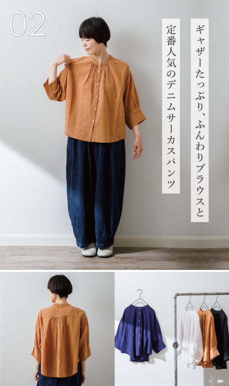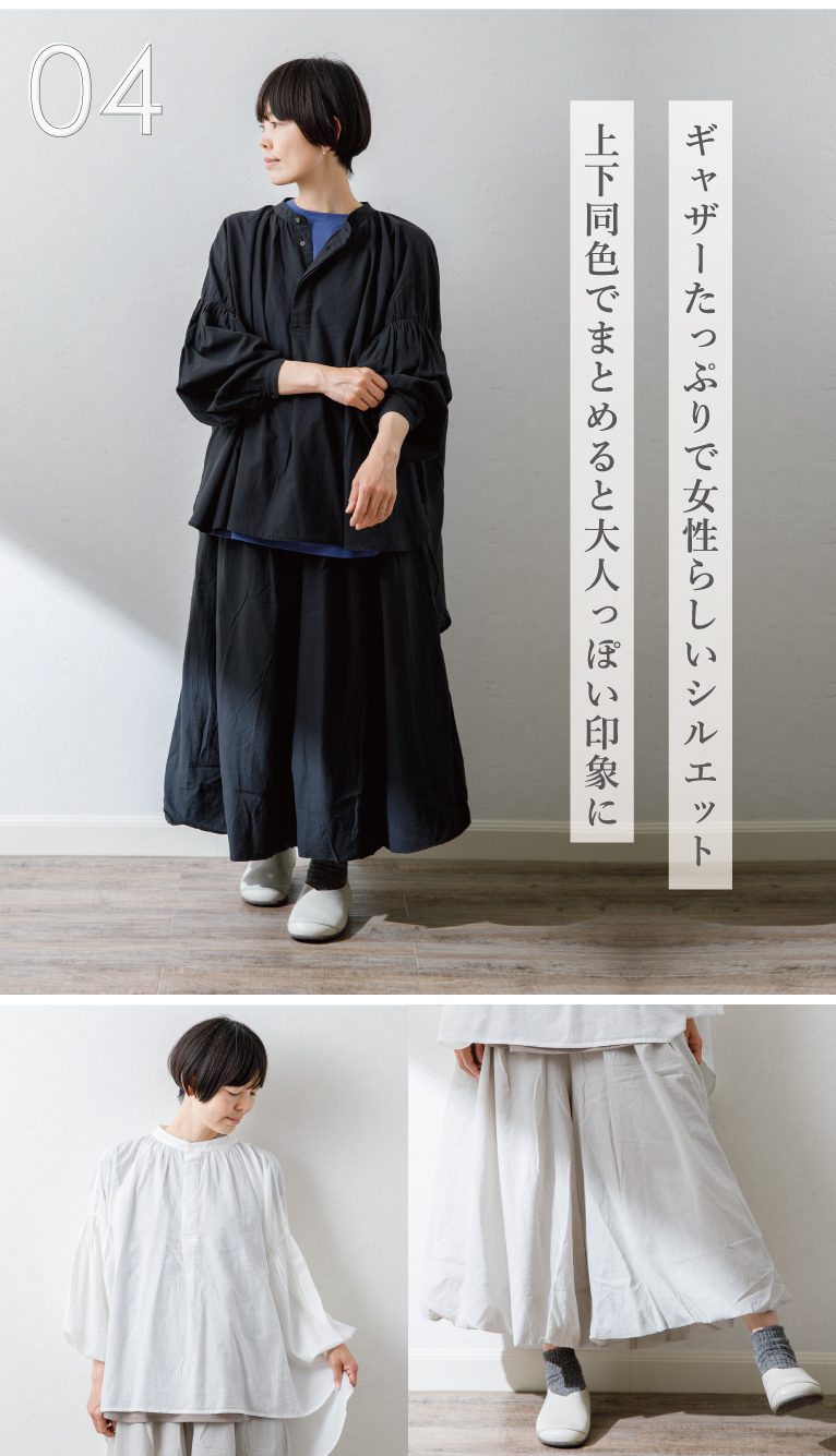 甘織りツイルコットンガーゼ素材のギャザーブラウスとアラジンパンツをセットアップでコーディネート。