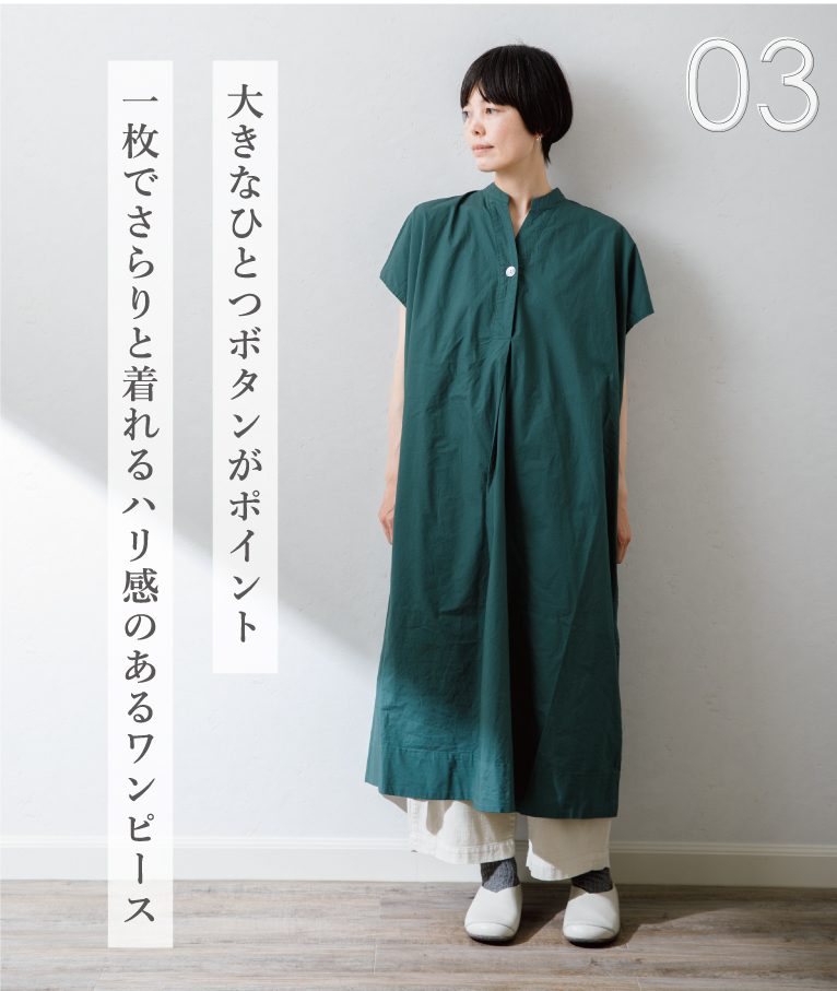 タイプライター生地でパリッとしたハリ感、コシのある質感が特徴のワンピース。