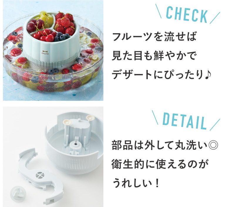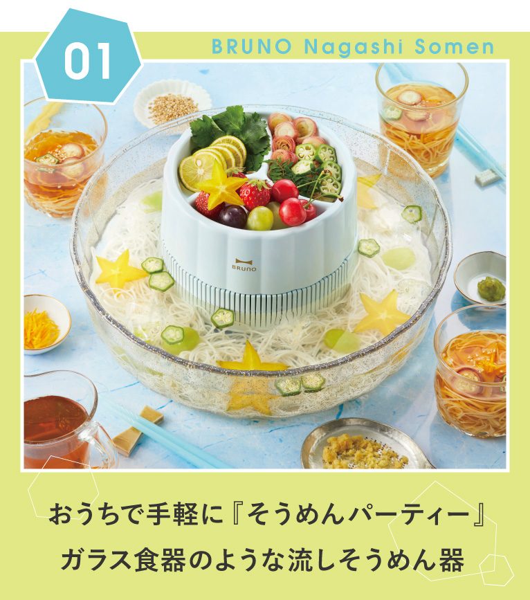 おうちで手軽に流しそうめんが楽しめる「BRUNO(ブルーノ) 流しそうめん」。淡いブルーとラメが涼しげなデザインです。電源ボタン1つの簡単操作&乾電池式なので、おうちだけでなくアウトドアにもぴったりです。