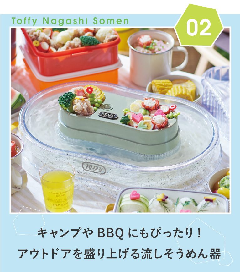 毎年大人気の「Toffy(トフィー) きらきら流しそうめん器」から最新モデルが登場!回転スピードを2段階調節できるようになりました。ほこりなどから薬味を守る薬味カバーや、冷たさキープの氷ケースなど、アウトドアでも楽しめる工夫が盛りだくさん♪