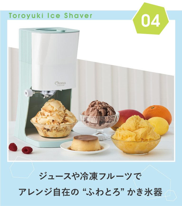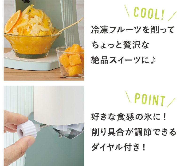 ふわふわとろとろのかき氷がおうちで簡単に作れるかき氷器。お好きな食感のかき氷が作れるダイヤルが付いています。ジュースを凍らせて味付きかき氷にしたり、冷凍フルーツを削ってトッピングしても◎凍らせたプリンをかき氷にするのもおすすめです♪