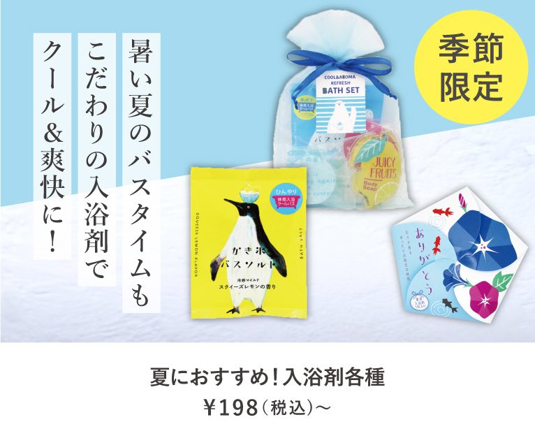個包装タイプの入浴剤は、気軽にいろんなものを試せるのがいいところ。冷感成分配合のスッキリとリフレッシュできるものや、暑さにお疲れ気味の体をやさしく労わるものなど、夏におすすめの入浴剤が続々入荷中!