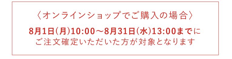 ※オンラインショップは8月1日(月)10:00~8月31日(水)13:00までにご注文確定いただいた方が対象となります