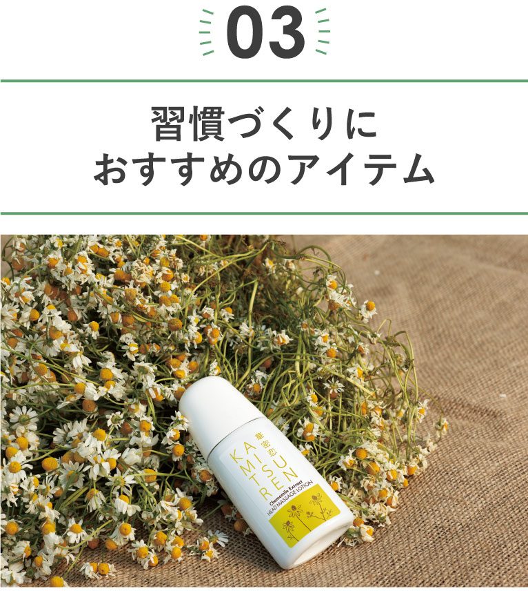 カミツレエキスとワサビ葉エキスだけで作った頭皮用マッサージローション。カモミールとワサビ葉の保湿効果で頭皮を整えます。