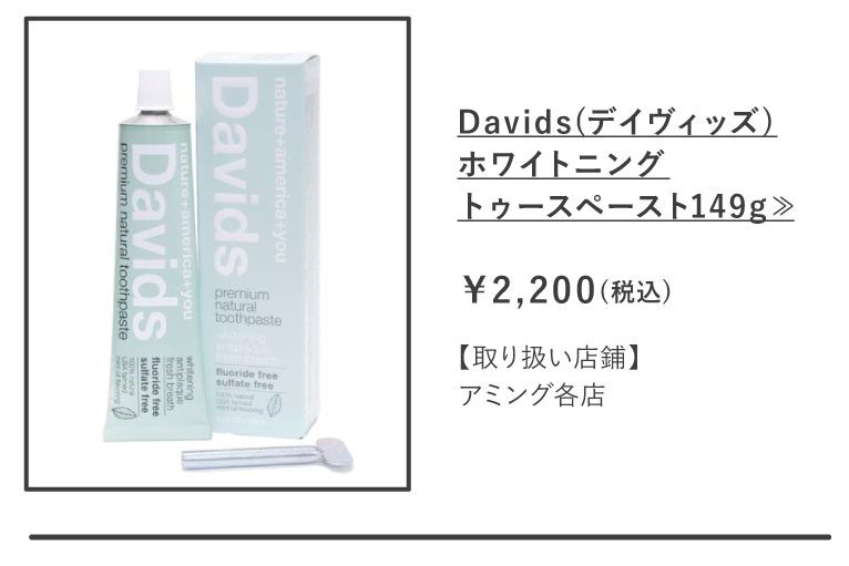 私は紅茶をよく飲むからなのか以前から色素沈着が気になり、クリーニングをしてもらうため歯科医院に定期的に通っています。そのためホワイトニング歯磨き粉は心強い味方。デイヴィッズを使