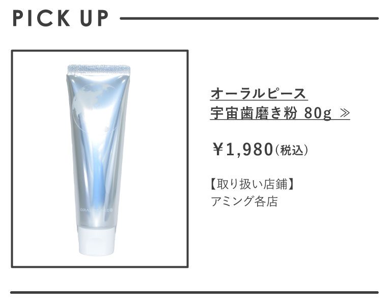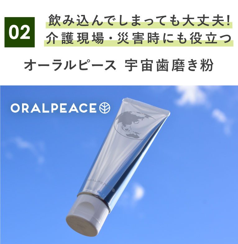 もう1つご紹介したいのが「オーラルピース 宇宙歯磨き粉」。日本発、世界15か国を超える国の医療・介護・感染予防・小児歯科・災害・アウトドア・ペットのオーラルケア分野で支持されてきた「オーラルピース」を、宇宙生活でも使用できるように!と開発されました。