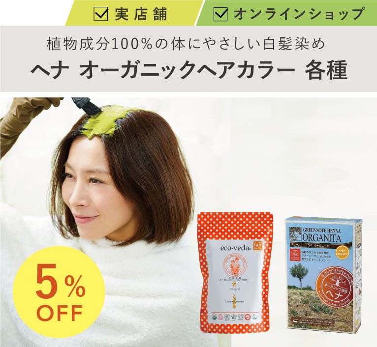 染めるだけでなく、髪を美しく健康に導く ヘナオーガニックヘアカラー各種が5%OFF!