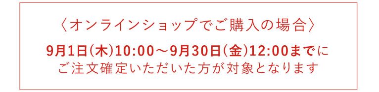 ※オンラインショップは9月1日(木)10:00~9月30日(金)12:00までにご注文確定いただいた方が対象となります