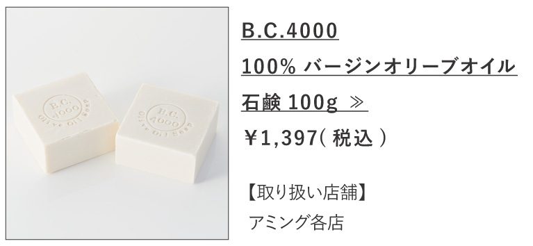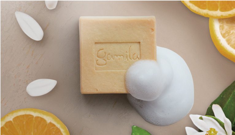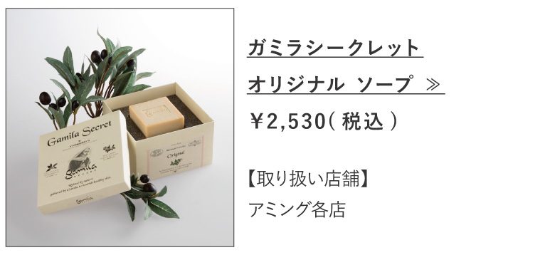 20種類のハーブと良質なエクストラバージンオリーブオイルをたっぷり使用した石鹸「ガミラシークレット」。アミングでもロングセラーの商品です。石鹸というより、肌の水分と油分のバランスを整えるスキンケアアイテムに近いです。