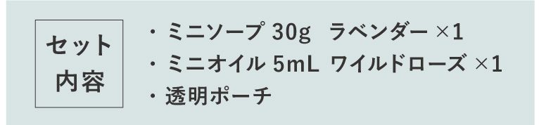 万人に愛される、朝にぴったりのすがすがしい香りの「ラベンダーミニソープ」と「ワイルドローズミニオイル」をセットにしたトライアルセット。