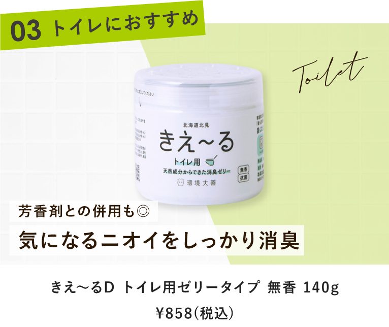 アンモニアなどの気になるニオイに効果的な「きえ~るD トイレ用ゼリータイプ」は、環境微生物群(乳酸菌等)を発酵・培養した「善玉活性水」から生まれたバイオ消臭ゼリーです。