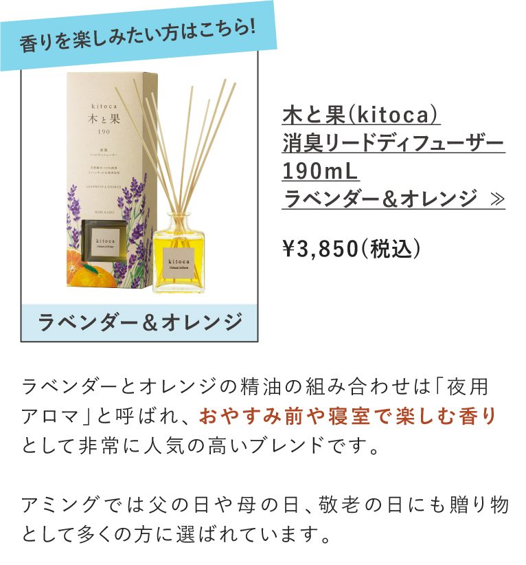 フローラル系よりもナチュラルな香りが馴染むキッチンにぴったりな、食品由来の柑橘系フレグランス。気になるニオイを消臭してくれる効果もあります。