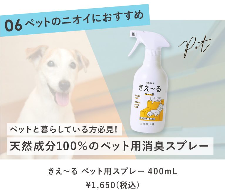 ペットと暮らしている方が待ち望んでいた、天然成分100%の消臭スプレー。ペットのトイレやベッド、おもちゃはもちろん、体毛のニオイ防止にもお使いいただけます。