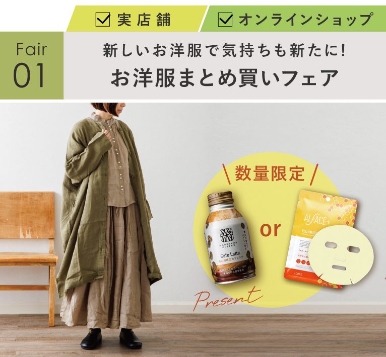 2月は大人のお洋服を3点以上ご購入のお客様に、「丸山珈琲のカフェラテ 1缶」か「オルフェスのフェイスマスク 1シート」のどちらかをプレゼント!