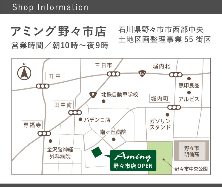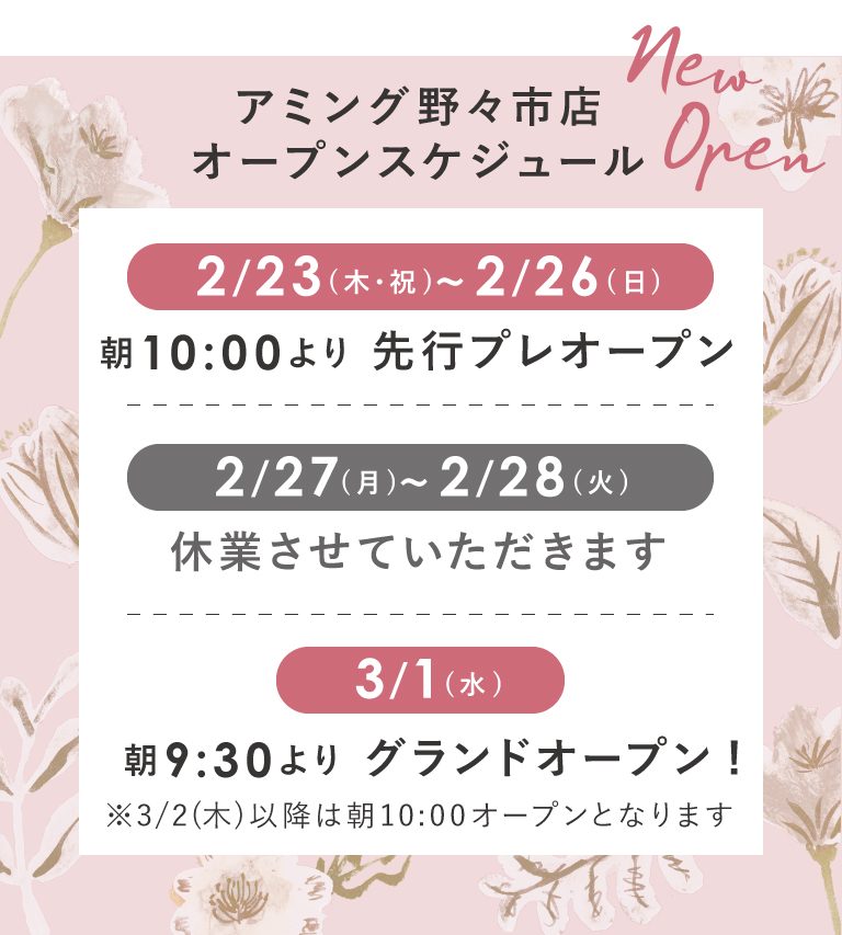 3月1日(水)石川県野々市市に、「アミング野々市店」をグランドオープン!オープンに先駆けて、2月23日(木・祝)から2月26日(日)までの4日間、プレオープンいたします!