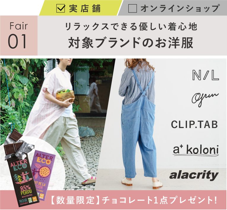 対象ブランドのお洋服を15,000円(税込)以上ご購入でオーガニックチョコレートを1点プレゼント!