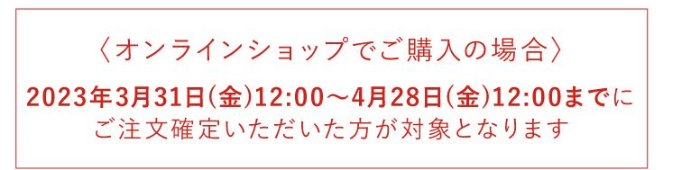 2023年3月31日(金)12:00~4月28日(金)12:00までにご注文確定いただいた方が対象
