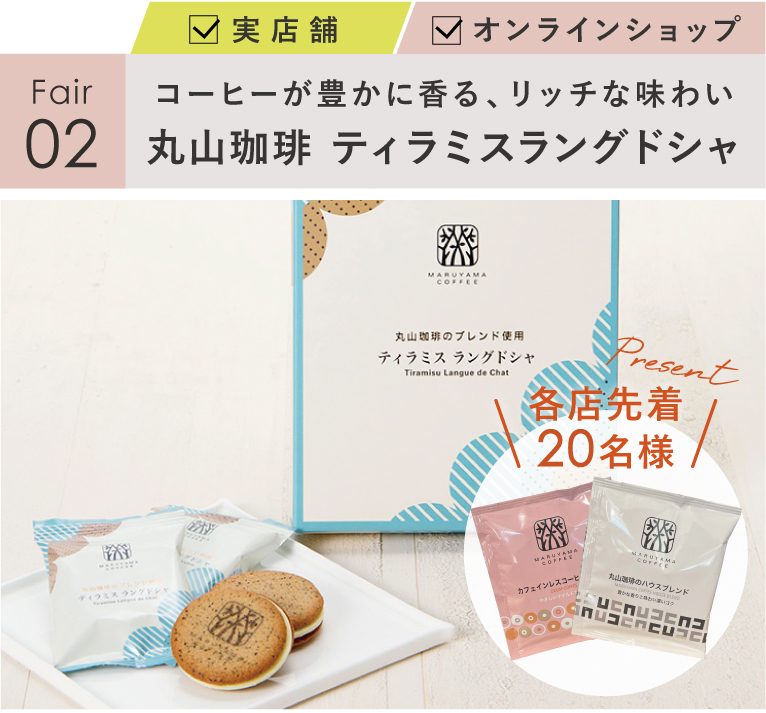 4月は丸山珈琲のティラミスラングドシャを1点ご購入で、新商品の丸山珈琲のドリップパック(1杯分)を2種類セットでプレゼント!