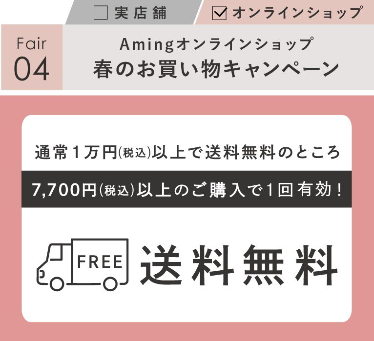 4月30日(日)18:00までの期間限定!オンラインショップで7,700円(税込)以上ご購入いただいた方に送料無料クーポンを配布中!
