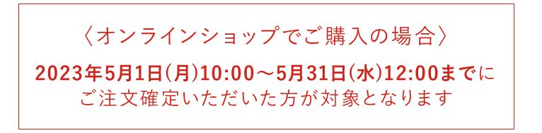 2023年5月1日(月)10:00~5月31日(水)12:00までにご注文確定いただいた方が対象