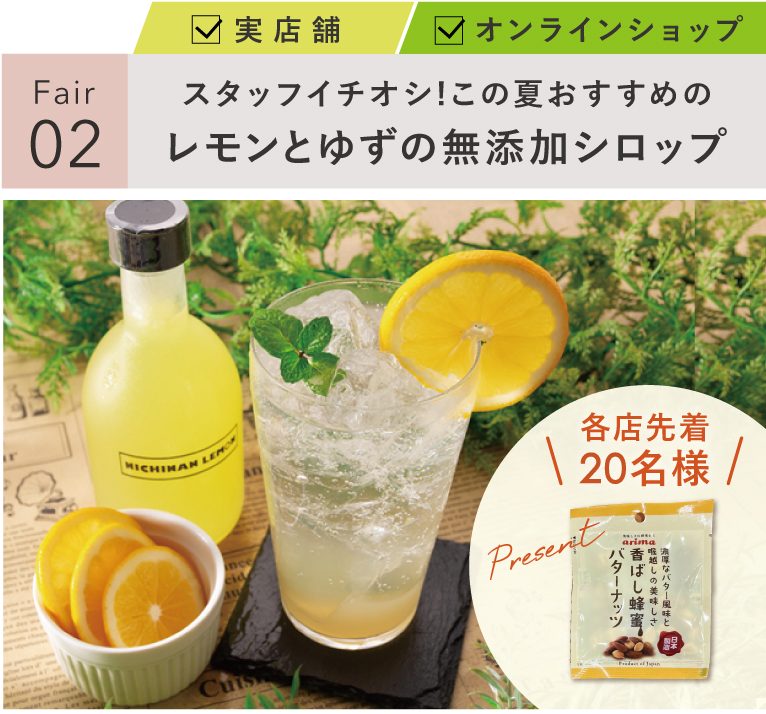 5月は「レモンシロップ」または「ゆずシロップ」を1点ご購入で、「香ばし蜂蜜バターナッツ(小袋)」を1点プレゼント!蜂蜜の甘さと香ばしいナッツのコクがやみつきのおいしさです。