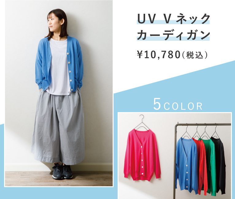 さらりとした肌触りのニットカーディガン。UVカット加工を施しており、日差しが強くなるこれからの季節に重宝する1枚です。