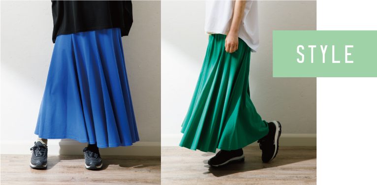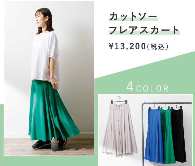 軽やかに揺れるフレアが上品なシルエットのスカート。シンプルなデザインなので、Tシャツやスウェットと合わせてカジュアルに、ブラウスと合わせてキレイめに、幅広い着こなしが楽しめる1枚です。