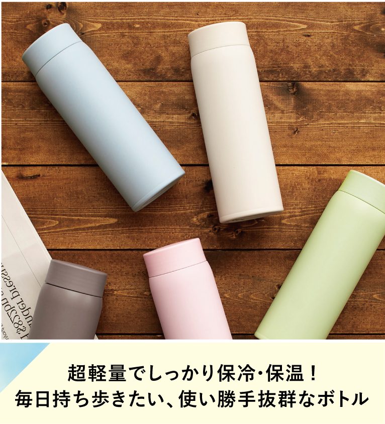 パステル&マットなカラーと丸みを帯びたフォルムが可愛い「ふわふわAir」は、480mLも入るのに超軽量で持ち運びにぴったり!ステンレス製の真空二重構造なので、朝入れた飲み物も夕方までしっかり保冷・保温することができます。口径が広く大きめの氷も入れられるので、これからの暑い時期に大活躍です。