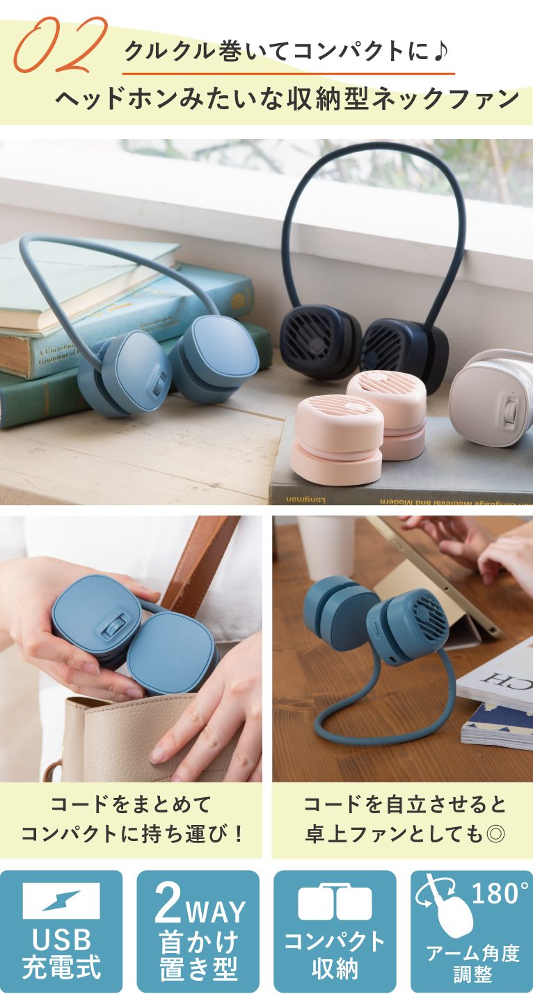 首にかけてもコーデの邪魔をせずおしゃれに馴染む、マットな質感と無駄のないシンプルなデザイン。ファンの角度も180度調整できるのでシーンに合わせて快適にお使いいただけます。