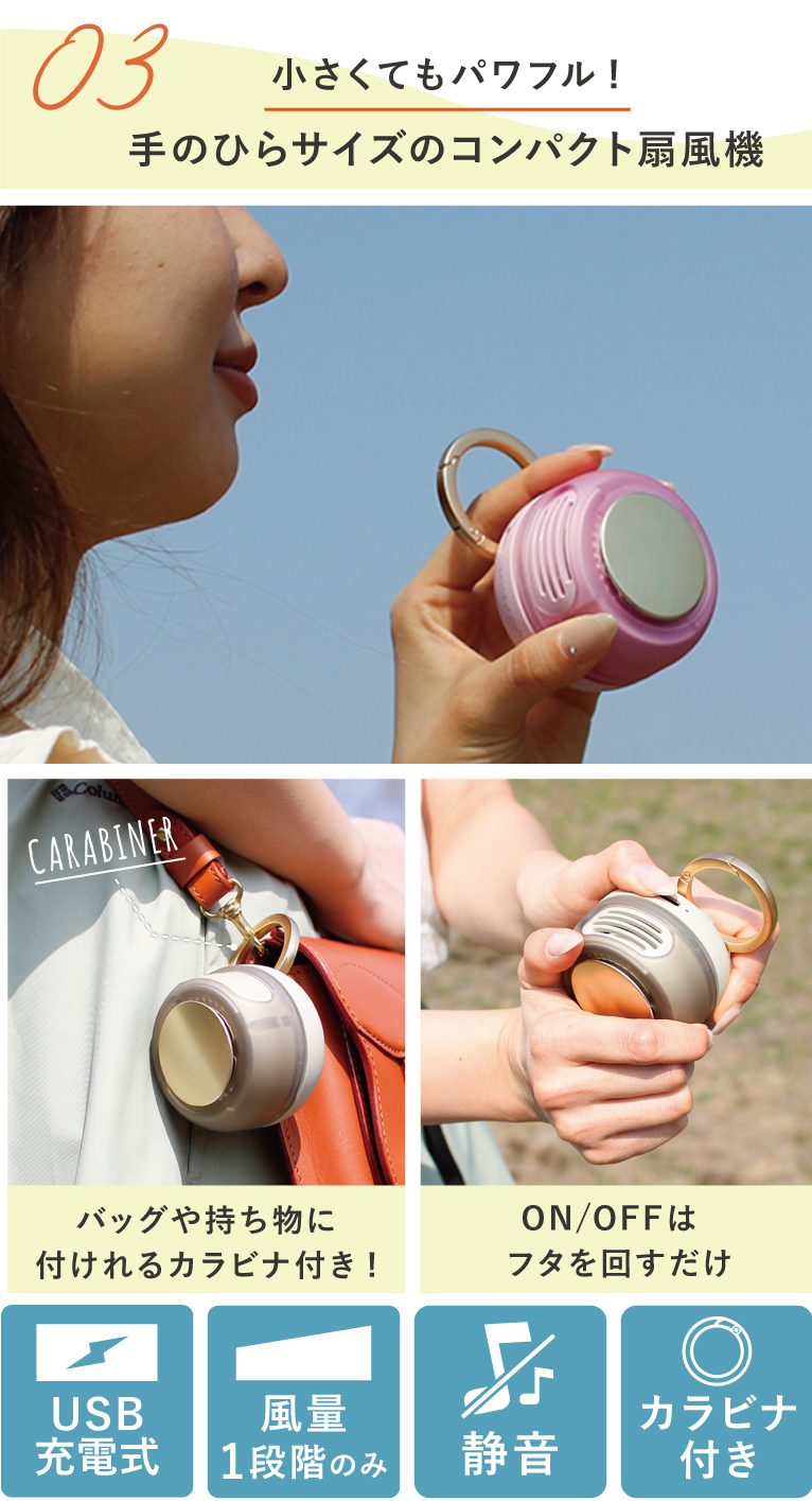 扇風機に見えないコロンとしたかわいいデザインの小型扇風機。フタを回すだけでON/OFFが可能です。コンパクトながら空気を送り出す力は強く静かで、心地良い風が吹き出します。カラビナ付きでバッグなどに取り付けられるのもうれしいポイント♪
