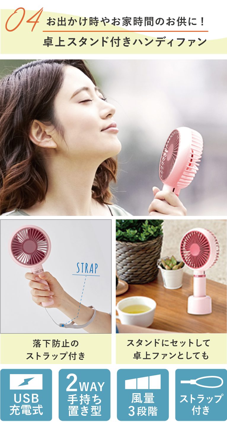 パワフルな風力で3段階切り替えが可能なハンディファン。お出かけ時はもちろん、スタンドにセットして卓上ファンとしても使える2WAY仕様です。