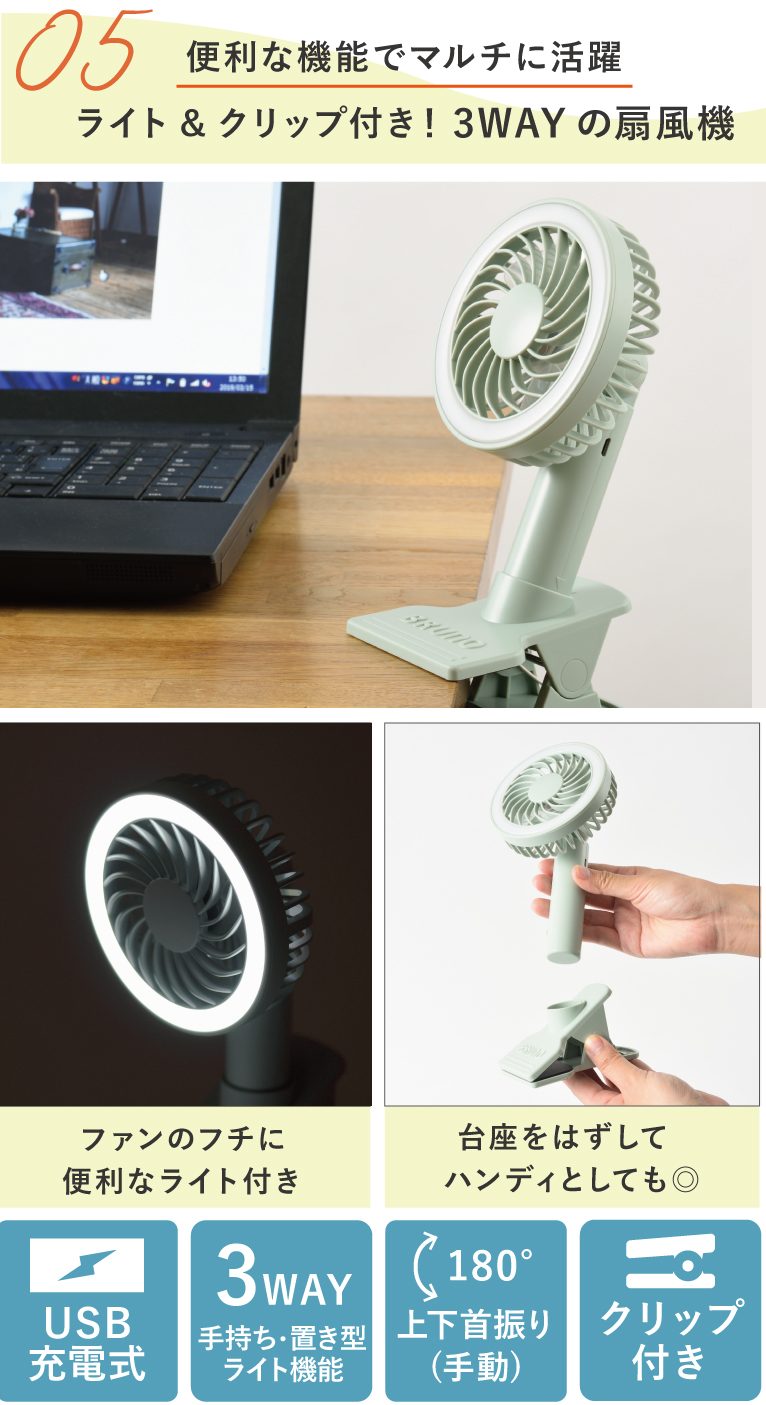 クリップがついてるので、卓上はもちろんソファーのひじ掛けやベビーカーなど、ちょっとしたスペースに固定できる便利な扇風機。ファンの周りにライトも付いているので、暗い手元を照らしたりメイクをするときなどマルチに活躍します。風量や光量の調節も可能で、台座を外すとハンディとしても使えます。