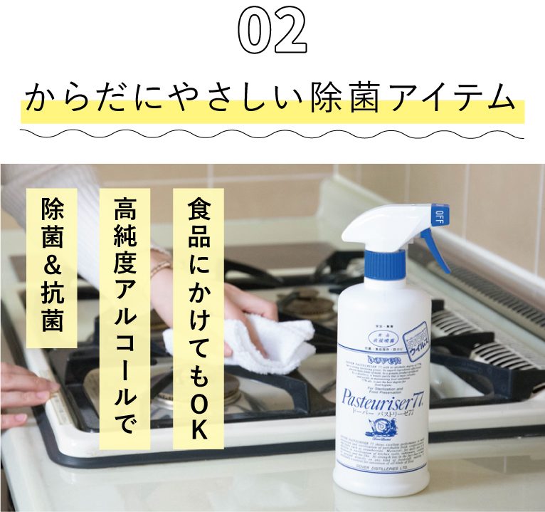 口に入っても害のない食品添加物で構成されているため、キッチン周りやお子様のおもちゃの除菌にもお使いいただけます。