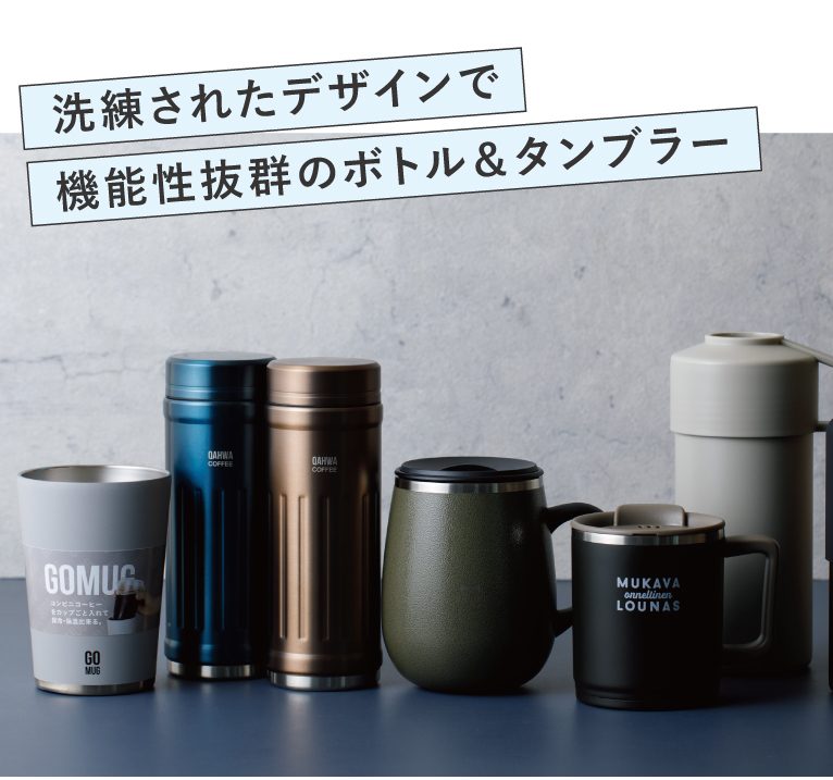 コーヒー専用や、保冷力抜群のサーモマグなど、デザインだけでなく機能性もバッチリのボトル&タンブラー。デスクワークのお父さんにぴったりです。