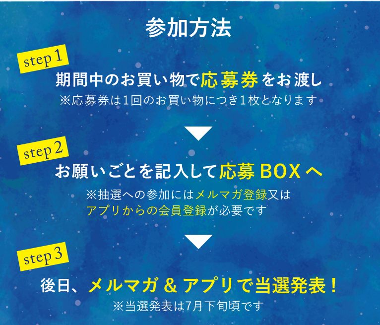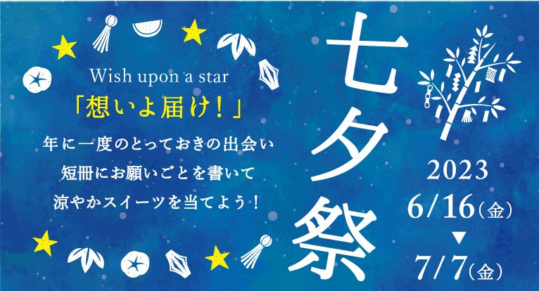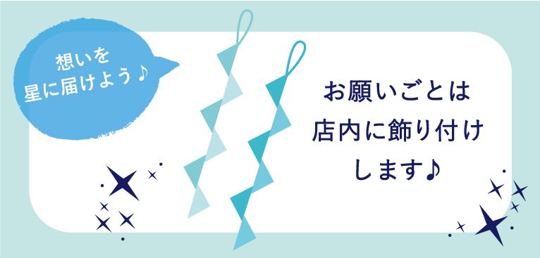 6/16(金)から7/7(金)までの期間中、「Wish upon a star七夕祭」を開催♪アミング実店舗にてお買い物いただいたお客様に、七夕の短冊を1枚お渡しいたします。年に一度の七夕!とっておきの願いを書きましょう♪