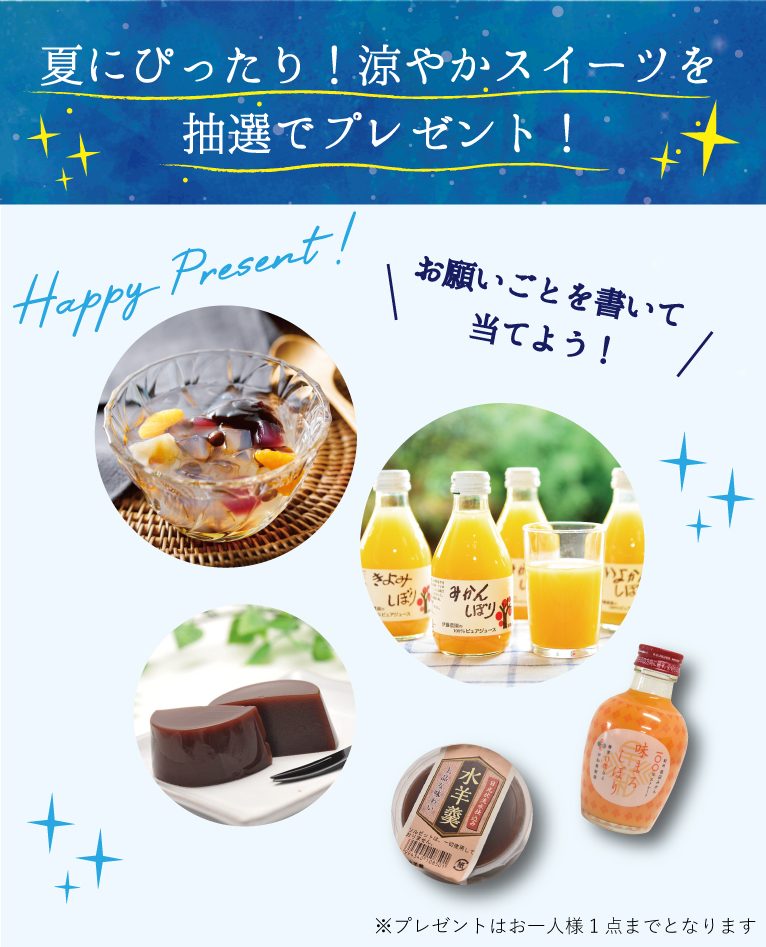 すっきり美味しい柑橘ドリンクや夏のおやつにぴったりのあんみつ、羊羹などが当たるチャンス!ぜひ、ご参加ください♪